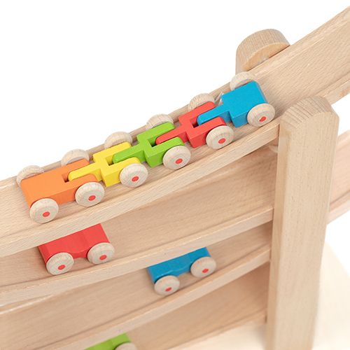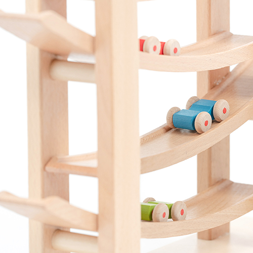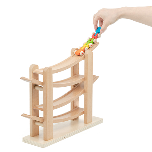 4段のスロープを右から左、次は左から右へと、車が転がり下りるスロープトイ。カタンコトンと転がり下りる車は、リズミカルで耳にも心地よく、繰り返し見ていても飽きません。お子さまが夢中になって遊べるおもちゃです。