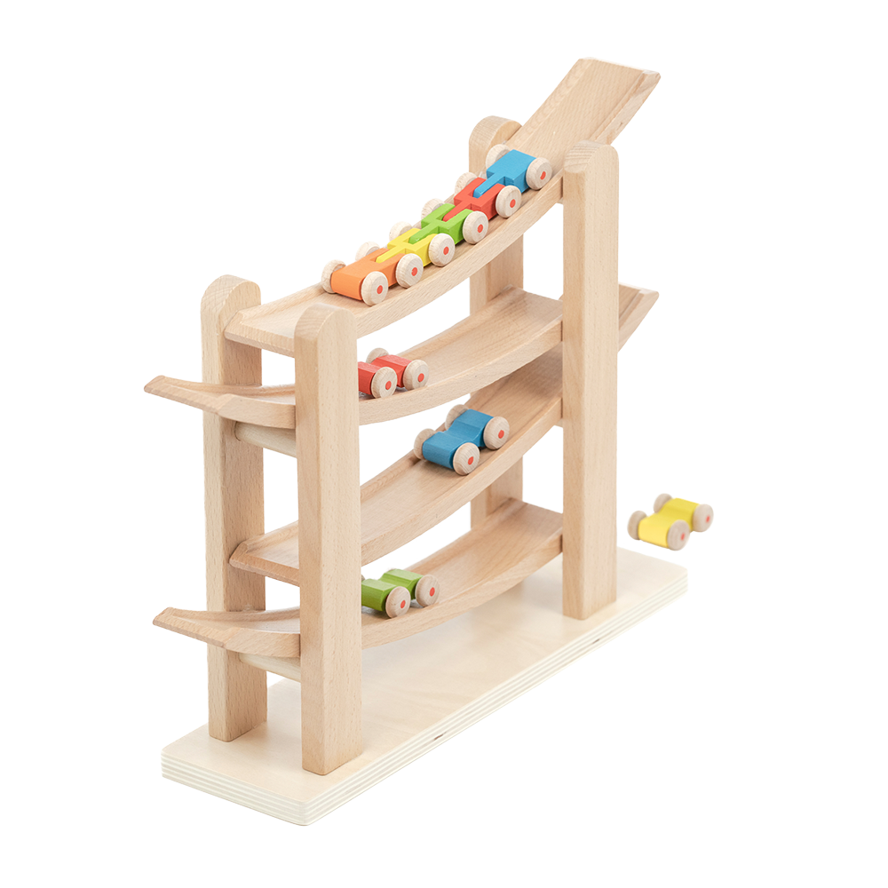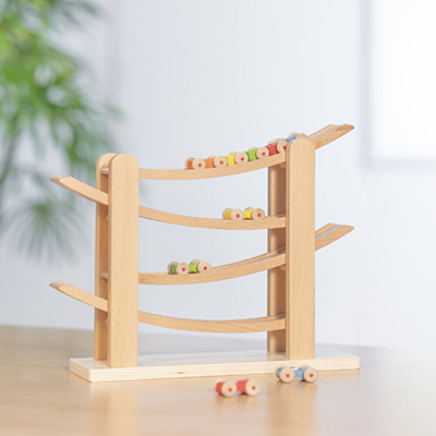 4段のスロープを右から左、次は左から右へと、車が転がり下りるスロープトイ。カタンコトンと転がり下りる車は、リズミカルで耳にも心地よく、繰り返し見ていても飽きません。お子さまが夢中になって遊べるおもちゃです。